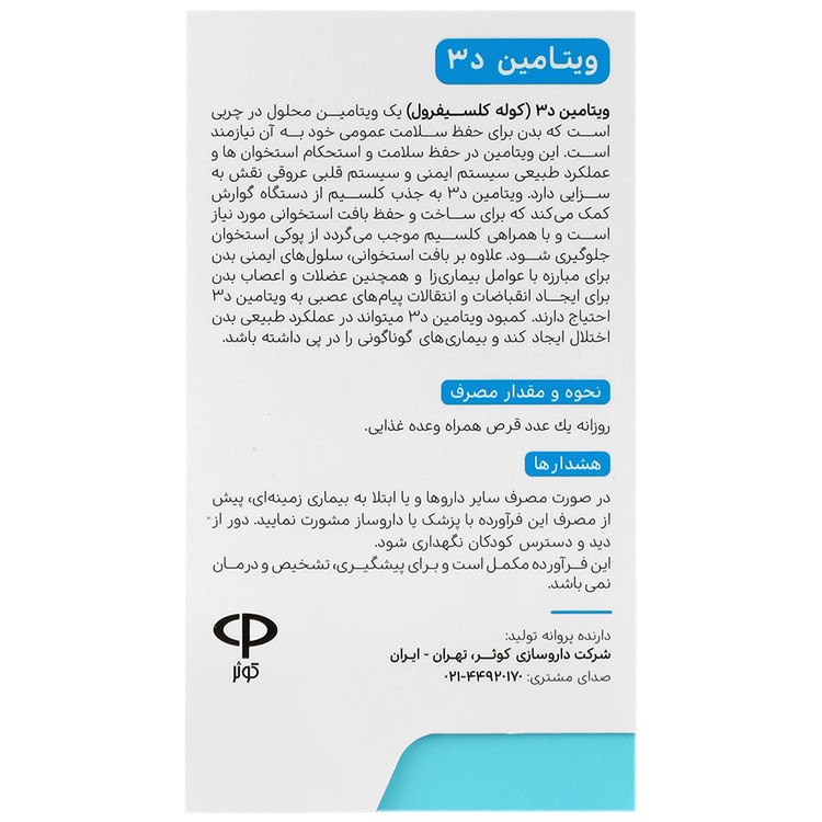 یک ویتامین محلول در چربی است که بدن برای حفظ سلامت عمومی خود به آن نیازمند است. این ویتامین در حفظ سلامت و استحکام استخوان ها و عملكرد طبيعی سيستم ایمنی و سیستم قلبی عروقی نقش به سزايي دارد. ویتامین د3 به جذب کلسیم از دستگاه گوارش کمک می کند که برای ساخت و حفظ بافت استخوانی مورد نیاز است و با همراهی کلسیم موجب می گردد از پوکی استخوان جلوگیری شود. علاوه بر بافت استخوانی، سلول های ایمنی بدن برای مبارزه با عوامل بیماری زا و همچنین عضلات و اعصاب بدن برای ایجاد انقباضات و انتقالات پیام های عصبی به ویتامین د3 احتیاج دارند. کمبود ویتامین د3 می تواند در عملکرد طبیعی بدن اختلال ایجاد کند و بیماریهای گوناگونی را در پی داشته باشد. تحقیقات نشان می دهند که رابطه ی مستقیمی بین سطوح خونی بسیار پایین ویتامین د3 و بروز بیماری های مختلف و سرطان وجود دارد. این کمبود در کودکان به ریکتز و در بزرگسالان به استئومالاسی می انجامد. این محصول می تواند به عنوان مکمل توسط همه ی افراد مصرف شود.