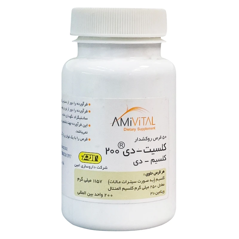 Calcit-D 200 Tablet / نوع محصول : قرص / تعداد در بسته : 50 عدد / شرکت تولید کننده : امین/ کلسیت دی 200 امین حاوی کلسیم و ویتامین د3 است که به حفظ و سلامت استخوان ها و دندان ها کمک می کند. کلسیت دی 200 امین برای درمان کمبود کلسیم که سبب از بین رفتن استخوان ها، پوکی استخوان، راشیتیسم، کاهش فعالیت غده پاراتیروئید و گرفتگی شبانه عضلات می شود، مورد استفاده قرار می گیرد. وجود ویتامین د در کلسیت دی امین سبب افزایش جذب کلسیم می شود. کلسیت دی 200 محتوی ۱۰۰۰ میلی گرم سیترات کلسیم و ۲۰۰ واحد ویتامین د۳ می باشد. احتمال رسوب کلسیم با ملح سیترات در کلیه کمتر است و در بیمارانی که نیاز به کلسیم دارند و سابقه سنگ کلیه داشته اند داروی مناسبی است