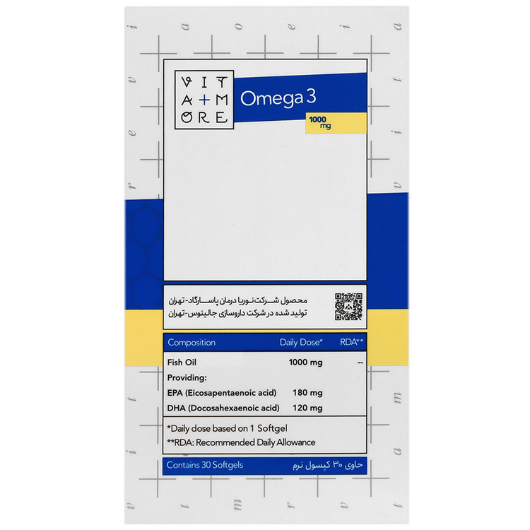 - امگا 3 ویتامور مکمل تغذیهای دارای 1000 میلی گرم روغن ماهی در هر کپسول