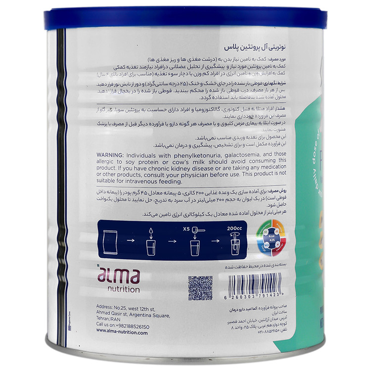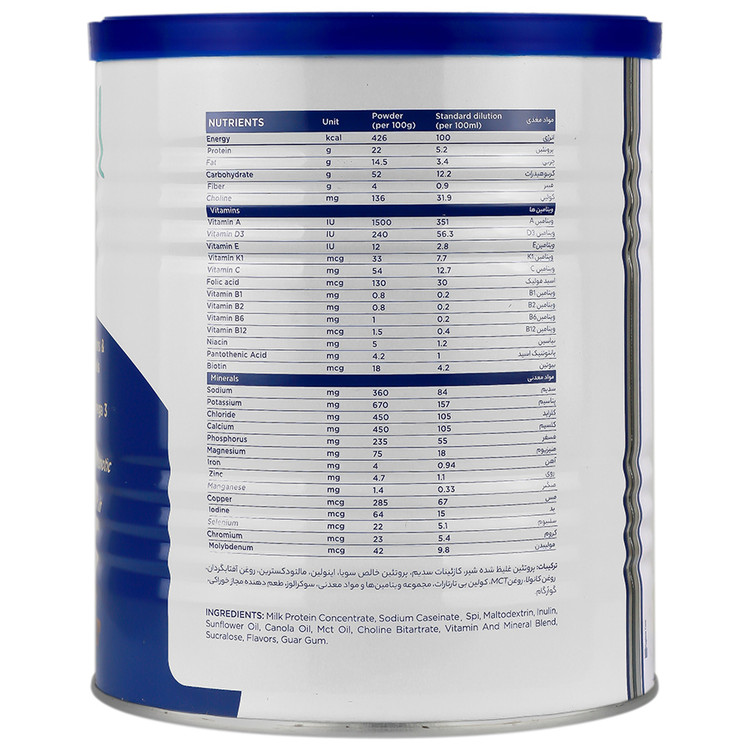 برای آماده سازی یک وعده غذایی 200 کالری، 5 پیمانه معادل 45 گرم پودر را (پیمانه داخل قوطی است) در یک لیوان به حجم 200 میلی لیتر در آب سرد به تدریج، حل نمایید تا محلول یکنواخت حاصل شود.