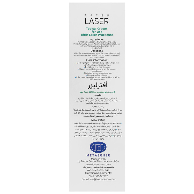 کامفر موجود در کرم افتر لیزر متاسنس می تواند به کاهش درد و سوزش ناشی از لیزر کمک کند. از سوی دیگر، زینک اکساید، روغن کنجد، عصاره کالاندولا و ویتامین E با دارا بودن آثار ضد التهابی و آنتی اکسیدانی، به کاهش التهاب کمک می کنند.