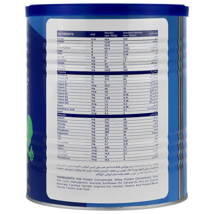 - حاوی پروتئین غلیظ شده آب پنیر، پروتئین غلیظ شده شیر، شیر بدون چربی، اینولین، مالتودکسترین، روغن آفتابگردان، روغن کانولا، روغن MCT، کولین بی تارتارات، کارنیتین تارتارات، آرژنین هیدروکلراید، اینوزیتول، مجموعه ویتامین ها و مواد معدنی، تورین، طعم دهنده های مجاز خوراکی و گوآرگام