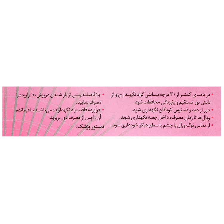 - عوارض جانبی: - قطره های چشمی به ندرت باعث تحریک خفیف چشم می شوند که با گذشت زمان برطرف شود اما در صورت بروز علائمی نظیر تحریک چشمی با داروساز یا پزشک مشورت نمایید.