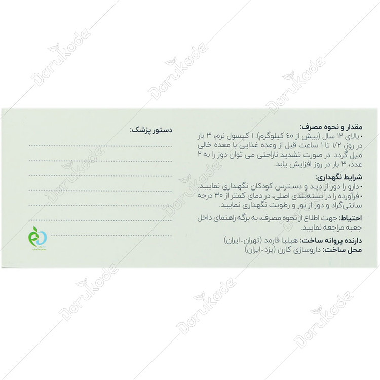 افراد بالای 12 سال (بیش از 40 کیلوگرم): 1 کپسول نرم، 3 بار در روز، 1/2 تا 1 ساعت قبل از وعده غذایی با معده خالی میل گردد.