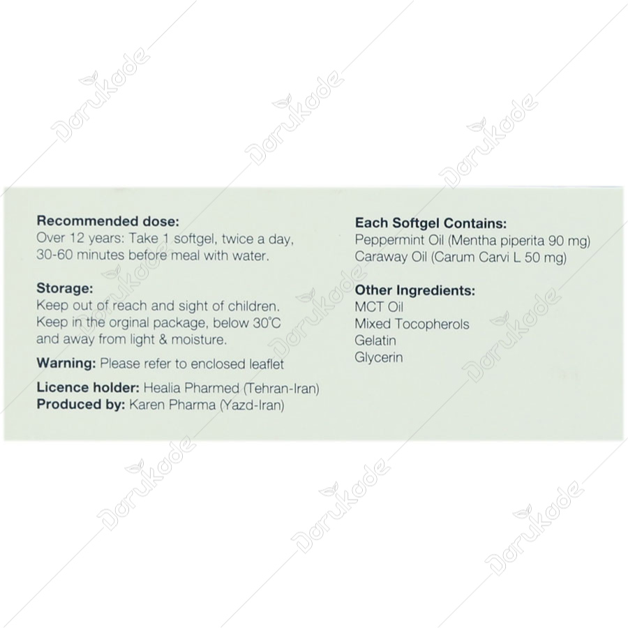 - هر کپسول نرم حاوی روغن نعنا فلفلی 90 میلی گرم و روغن زیره 50 میلی گرم