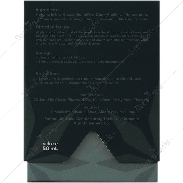 - ترکیبات: کانابیدیول(CBD)، متیل سالیسیلات، گلوکز آمین سولفات، دی متیل سولفون