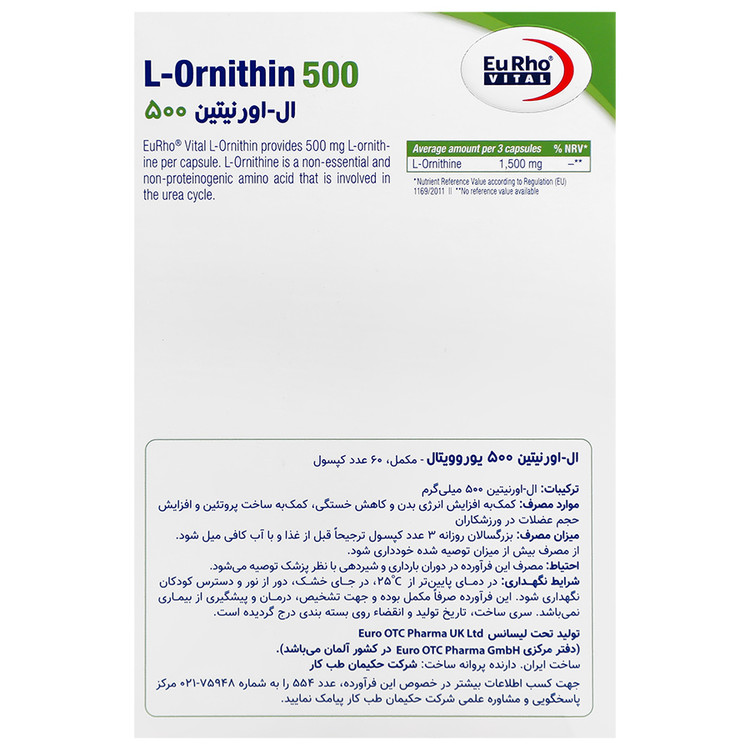 کپسول ال-اورنیتین 500 یوروویتال حاوی 500 میلیگرم آمینو اسید ال-اورنیتین هیدروکلراید است که به کاهش احساس خستگی، افزایش حجم عضلات در ورزشکاران و کاهش سطح استرس کمک میکند.