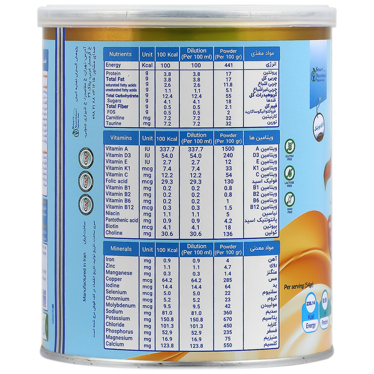 - فاقد آسپارتام، اسیدهای چرب ترانس، مواد تراریخته، گلوتن و لاکتوز