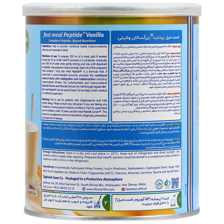 - فست میل پپتاید فرمولاسیون کامل و متعادل بر پایه پروتئین وی هیدرولیز شده