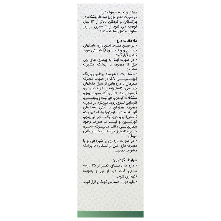 - ملاحظات دارو: - در حین مصرف این دارو، غلظت های کلسیم و ویتامین D بایستی مورد کنترل قرار گیرد. - در صورت ابتلا به بیماری های زیر، قبل از مصرف با پزشک مشورت نمایید: حساسیت به هر نوع ویتامین و رنگ (ویتامین A)، در صورت مصرف همزمان با داروهایی از قبیل مکمل های کلسیمی، کلستیرامین، ایزوترتینوئین، قرص های ضد بارداری، الکلیسم، سیروز و مشکلات کبدی، هپاتیت ویروسی، نارسایی کلیوی (ویتامین D)، در صورت مصرف همزمان با آنتی اسیدهای آلومینیوم دار، باربیتورات ها، اتیدرونیت، کلستیرامین، دیورتیک های تیازیدی، کورتون و نیز در صورت وجود بیماری هایی مانند هایپرکلسیمی، هایپرویتامینوز، ناراحتی های قلبی عروقی.
