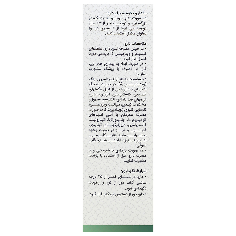 - ملاحظات دارو: - در حین مصرف این دارو، غلظت های کلسیم و ویتامین D بایستی مورد کنترل قرار گیرد. - در صورت ابتلا به بیماری های زیر، قبل از مصرف با پزشک مشورت نمایید: حساسیت به هر نوع ویتامین و رنگ (ویتامین A)، در صورت مصرف همزمان با داروهایی از قبیل مکمل های کلسیمی، کلستیرامین، ایزوترتینوئین، قرص های ضد بارداری، الکلیسم، سیروز و مشکلات کبدی، هپاتیت ویروسی، نارسایی کلیوی (ویتامین D)، در صورت مصرف همزمان با آنتی اسیدهای آلومینیوم دار، باربیتورات ها، اتیدرونیت، کلستیرامین، دیورتیک های تیازیدی، کورتون و نیز در صورت وجود بیماری هایی مانند هایپرکلسیمی، هایپرویتامینوز، ناراحتی های قلبی عروقی.