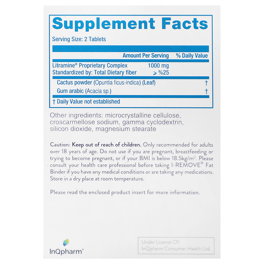 آی ریموو از کمپلکس فیبر طبیعی با فرمولاسیون دارای حق ثبت انحصاری لیترامین ساخته شده است و از نظر بالینی نشان داده شده است که مصرف آن همزمان با رژیم غذایی نسبت به زمانی که فرد به تنهایی دارای رژیم غذایی است تا سه برابر بیشتر باعث کاهش وزن می شود.این فراورده به چربی موجود در غذا متصل شده و مانع از جذب آن می شود. مطالعات نشان می دهد که این ترکیب می تواند تا حدود 28 درصد از چربی غذا را به خود باند کرده و از طرفی هم باعث افزایش احساس پری و سیری می شود.