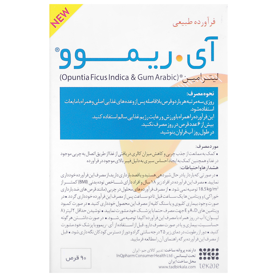 - احتیاطات: - این محصول فقط برای استفاده در افراد بالای 18 سال توصیه می شود. - در صورتی که باردار یا در حال شیردهی هستید و یا قصد بارداری دارید، از مصرف این فراورده خودداری نمایید. - مصرف این فراورده در افراد دارای شاخص توده بدنی (BMI) کمتر از 18.5 توصیه نمی شود. - از مصرف داروهای محلول در چربی (مانند قرص های ضد بارداری خوراکی) و ویتامین ها تا دو ساعت قبل و بعد از مصرف آی ریموو اجتناب گردد. - مانند هر محصولی با فیبر بالا، نوشیدن حداقل 2 لیتر (8 لیوان) آب در روز توصیه می شود؛ در صورت مصرف ناکافی مایعات ممکن است یبوست خفیف ایجاد شود. - اگر مستعد کمبود ویتامین های E و A ،D هستید، در صورت نیاز به مصرف این مکمل ها حتما با پزشک خود مشورت کنید. - لیترامین ممکن است باعث کاهش جذب این ویتامین ها شود. - آی ریموو حاوی مقدار اندکی اسید اگزالیک است که در بسیاری از سبزیجات سبز رنگ یافت می شود. در صورت وجود بیماری کلیوی و یا سنگ کلیه از مصرف این فراورده خودداری کنید. - در صورت داشتن هرگونه حساسیت، بیماری و یا در صورت مصرف دارو، قبل از استفاده از فراورده با پزشک خود مشورت کنید.