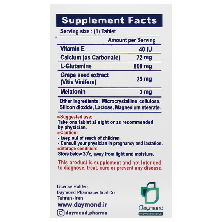 - حاوی ملاتونین، عصاره هسته انگور، ال- گلوتامین، ویتامین E و کلسیم