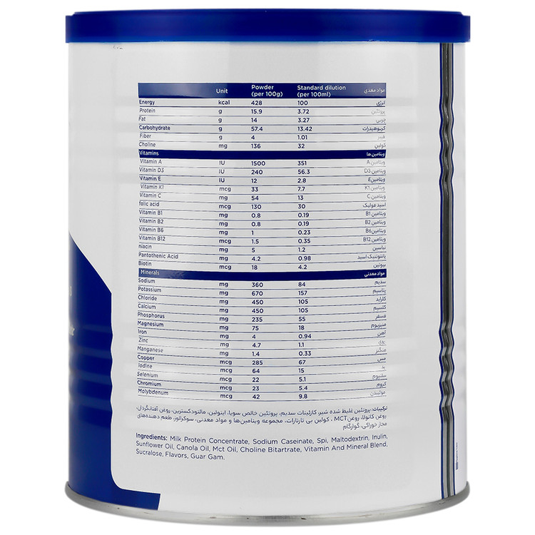 برای آماده سازی یک وعده غذایی 200 کالری، 5 پیمانه معادل 45 گرم پودر را (پیمانه داخل قوطی است) در یک لیوان به حجم 200 میلی لیتر در آب سرد به تدریج، حل نمایید تا محلول یکنواخت حاصل شود.