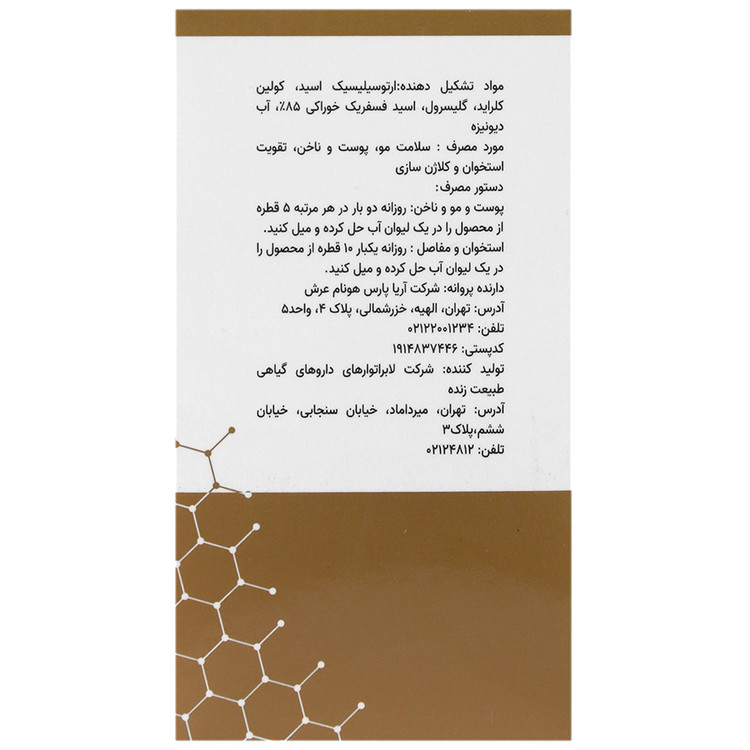 پوست و مو و ناخن: روزانه دو بار (در هر مرتبه 5 قطره) از محصول را در یک لیوان آب و یا نوشیدنی طبیعی حل کرده و میل نمایید. (به جز نوشیدنی های گازدار و الکلی)