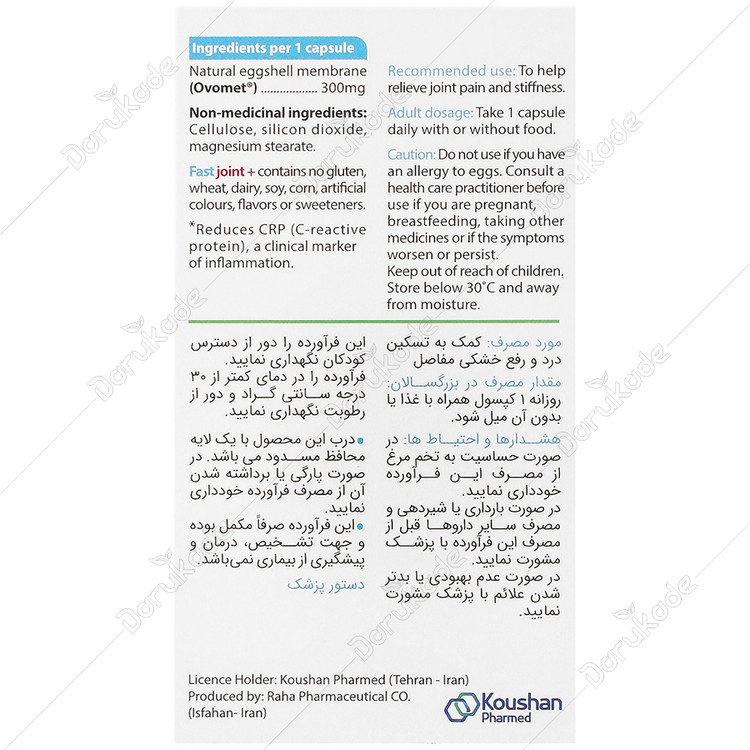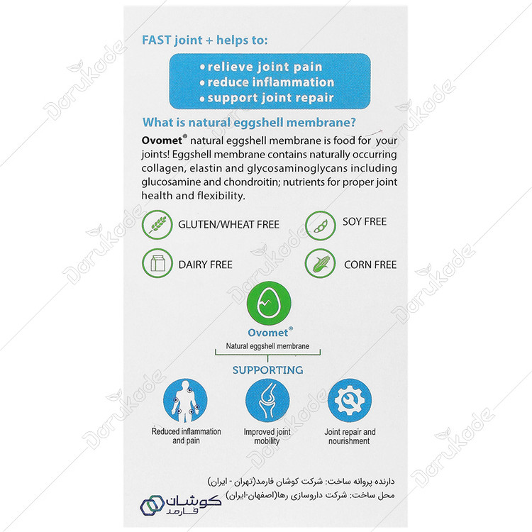 این محصول که حاوی ماده موثره بیووافکس است که از هیدولیز (تجزیه) و خالص سازی غشای داخل پوسته تخم مرغ تهیه شده، همراه سایر ترکیبات خود، فرآورده ای است که باعث درمان سریع و موثر جهت کاهش درد، التهاب و بهبود حرکت و انعطاف پذیری مفاصل در بیماران می گردد. ماده موثره بایووافکس، حاوی 90% پروتئین است که غنی از پروتئین های فیبروزی مانند کلاژن نوع I و الاستین و اسیدهای آمینه مختلف می باشد که از آسیب بیشتر به بافت غضروف جلوگیری کرده و به ترمیم و بازسازی آن کمک می کند. همچنین این ماده حاوی گلیکوز آمینو گلیکان ها مانند کندرویتین سولفات، گلوکزآمین و هیالورونیک می باشد که به واسطه خاصیت ضد التهابی شان به کاهش التهاب موجود در مفاصل کمک کرده و در کنار آن آنتی اکسیدان های موجود در بایووافکس از آسیب های ناشی از رادیکال های آزاد به بافت پیشگیری می نماید. لازم به ذکر است این محصول که در 5 روز موجب کاهش التهاب و درد موجود در مفاصل می گردد. - این محصول تحت امتیاز و لیسانس شرکت جنیون هلث کانادا، دارای پروانه ساخت شرکت کوشان فارمد در ایران می باشد.