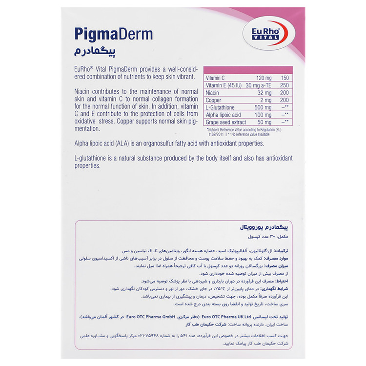 عوامل مختلفی از جمله اشعه ماورا بنفش خورشید، افزایش سن، استرس و مصرف غذاهای ناسالم و فرآوری شده باعث تیره شدن پوست، بروز لکها و چین و چروکهای پوستی میشود. ترکیبات آنتیاکسیدانی به روشن شدن پوست، از بین رفتن لکهای پوستی و ترمیم پوست کمک میکنند. کپسول پیگمادرم یوروویتال حاوی ال-گلوتاتیون، عصاره هسته انگور، آلفا لیپوئیک اسید، ویتامینهای E و C، نیاسین و مس است که اثرات مثبتی در شادابی و سلامت پوست، مو و ناخن دارد.