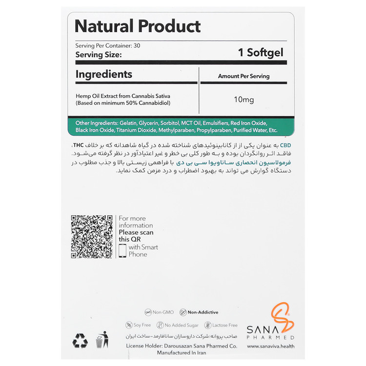 CBD با اثر بر سیستم اندوکانابینوئید بدن، بسیاری از فرآیندهای فيزيولوژيکی از جمله درد، التهاب، خلق و خو، اشتها و خواب را تنظیم می کند. CBD همچنين بر گيرنده های دیگر بدن مانند گيرنده های سروتونين و دوپامين که در تنظیم حالات روحی و اضطراب نقش دارند، تأثير می گذارد. یکی از مهم ترين مشکلات مکمل های تغذیه ای رايج CBD در بازار دارويی، فراهمی زيستی بسیار کم، جذب بسیار پایين و ناپایداری آن ها در محیط اسیدی دستگاه گوارش می باشد. لذا برای حل اين مشکلات، فرمولاسيون اختصاصی ساناويوا CBD طراحی شده تا به محض قرار گيری CBD در محیط آبی دستگاه گوارش و به کمک حرکات دودی دستگاه گوارش، ذرات ريز حاوی CBD تشکیل می شوند.