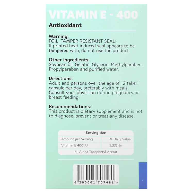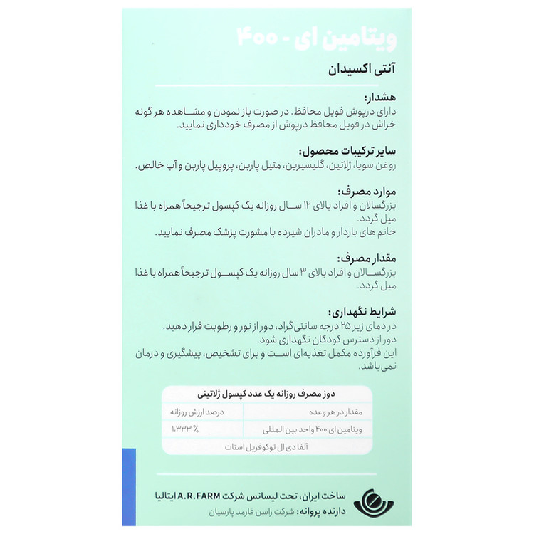 | ویتامین ای ( آلفا توکوفرول استات ) | Vitamin E ( Alfa Tocopheryl Acetate ) | 400 IU | 1.333 |