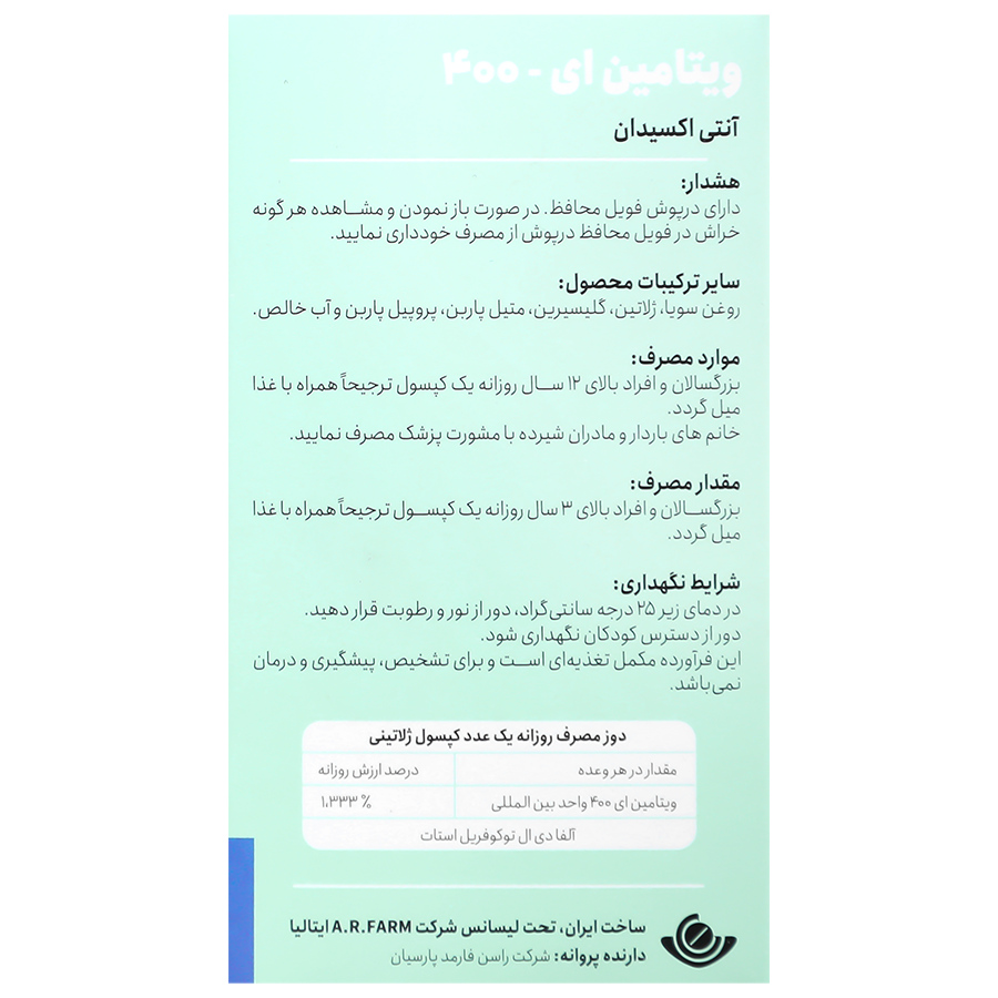 | ویتامین ای ( آلفا توکوفرول استات ) | Vitamin E ( Alfa Tocopheryl Acetate ) | 400 IU | 1.333 |