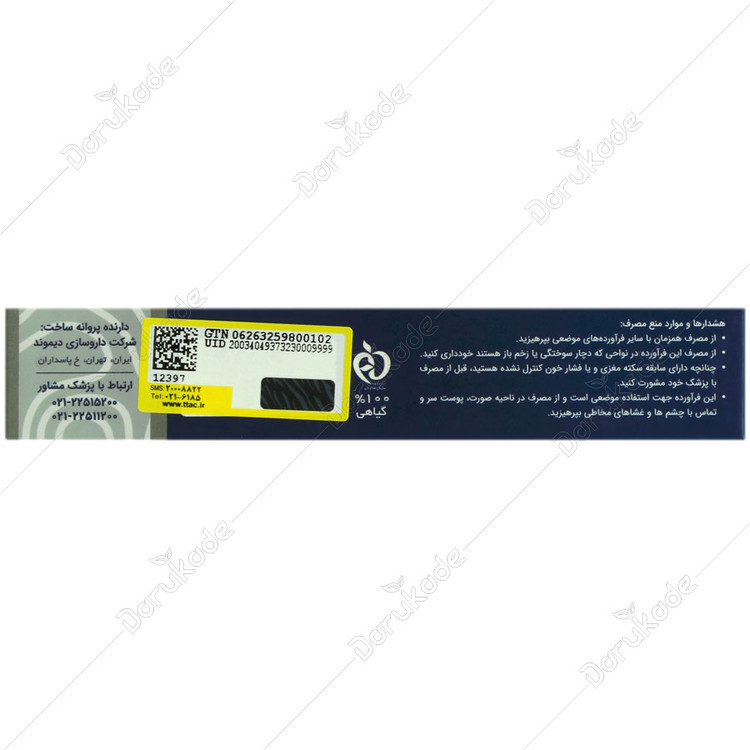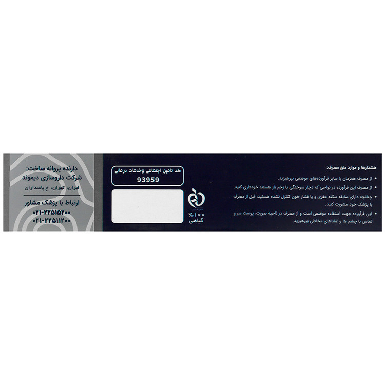 - احتیاطات: از مصرف این فرآورده در نواحی که دارای سوختگی یا زخم باز هستند خودداری کنید. چنانچه دارای سابقه سکته مغزی یا فشارخون کنترل نشده هستید، قبل از مصرف با پزشک خود مشورت کنید. از مصرف همزمان با سایر فرآورده های موضعی بپرهیزید. این فرآورده جهت استفاده موضعی می باشد و از مصرف در ناحیه صورت، پوست سر و تماس با چشمها و غشاهای مخاطی بپرهیزید.
