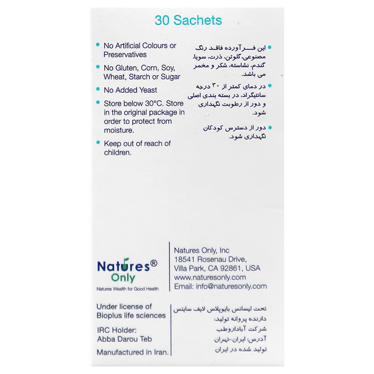 - فاقد رنگ مصنوعی، گلوتن، ذرت، سویا، گندم، نشاسته، شکر و مخمر