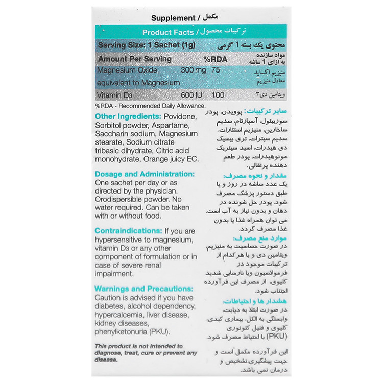 - موارد منع مصرف: در صورت حساسیت به منیزیم، ویتامین دی و یا هر کدام از ترکیبات موجود در فرمولاسیون و یا نارسایی شدید کلیوی، از مصرف آن اجتناب شود.