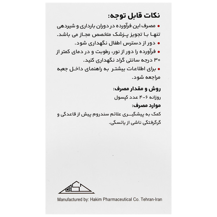 - موارد احتیاط و منع مصرف: - در صورت وجود حساسیت شناخته شده نسبت به اجزا فراورده مصرف آن توصیه نمی گردد. - مصرف در دوران بارداری و شیردهی تحت نظر پزشک متخصص صورت پذیرد.