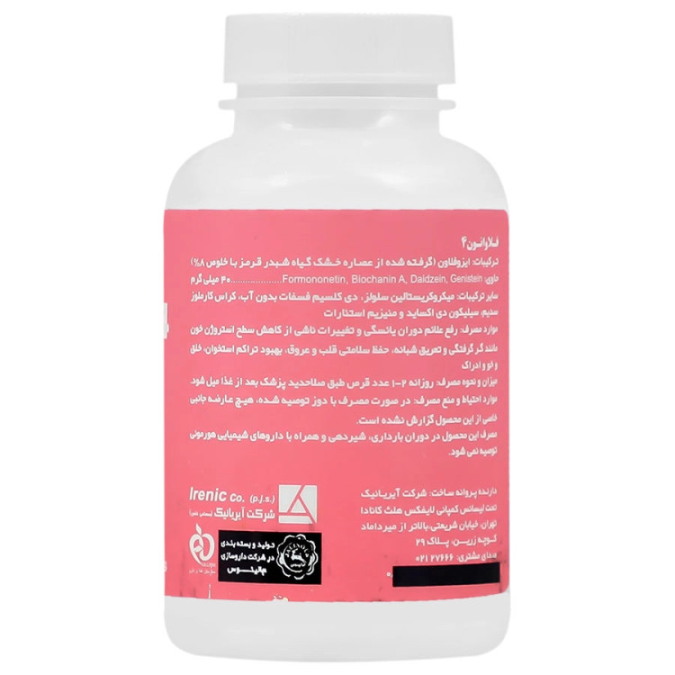 حاوی ترکیباتی شامل ایزوفلاون (گرفته شده از عصاره خشک گیاه شبدر قرمز با خلوص 8%) و Genistein، Daidzein، Biochanin، Formononetin به مقدار 40 میلی گرم