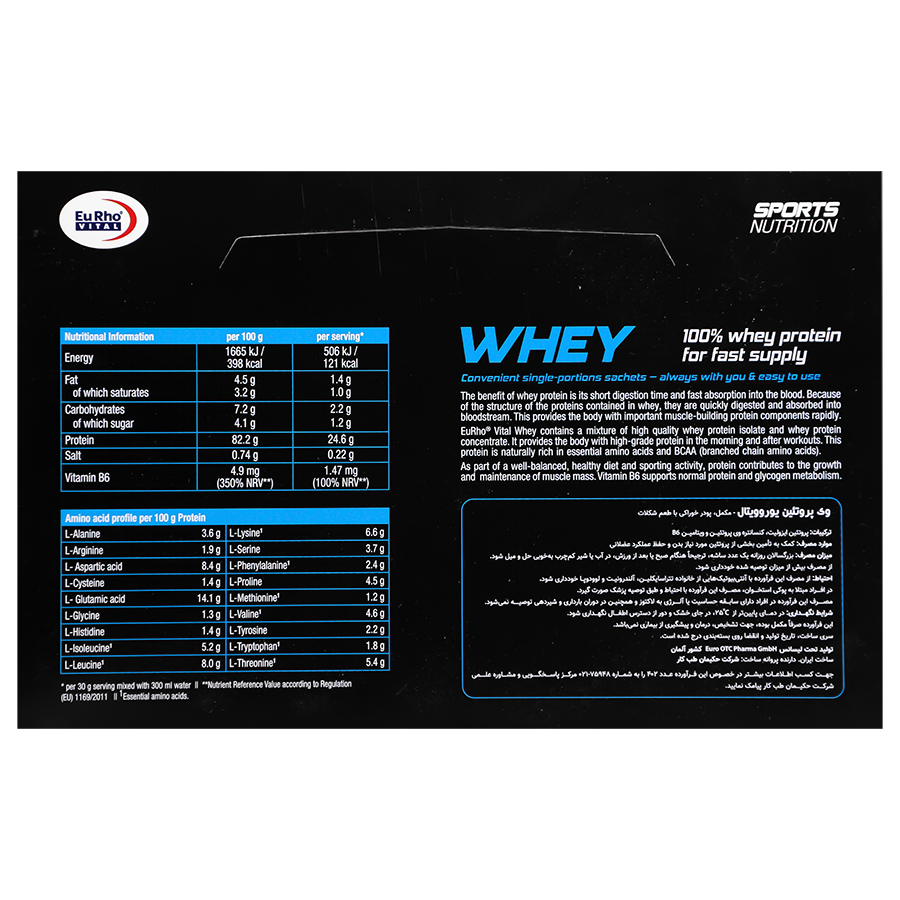 وی پروتئین یکی از موثرترین و رایجترین مکملهای ورزشی است که باعث عضلهسازی و بهبود عملکرد ورزشی میشود. وی پروتئین بهراحتی هضم میشود، جذب بالایی دارد و به ریکاوری عضلات بعد از تمرینات ورزشی کمک میکند. علاوه بر ورزشکاران، دریافت وی پروتئین مانع از تحلیل عضلات در سالمندان، بیماران و همه افرادی میشود که پروتئین کافی دریافت نمیکنند. ساشه وی پروتئین یوروویتال حاوی 24 گرم پروتئین وی در هر ساشه است که با بستهبندی مجزا، حمل و استفاده آسانی دارد.