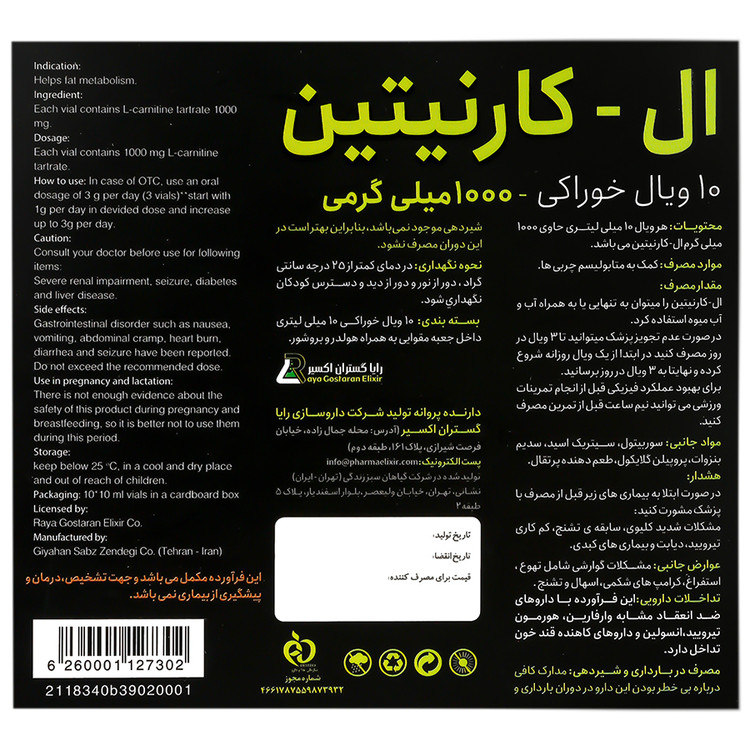 - هر ویال 10 میلی لیتری حاوی 1000 میلی گرم ال کارنیتین