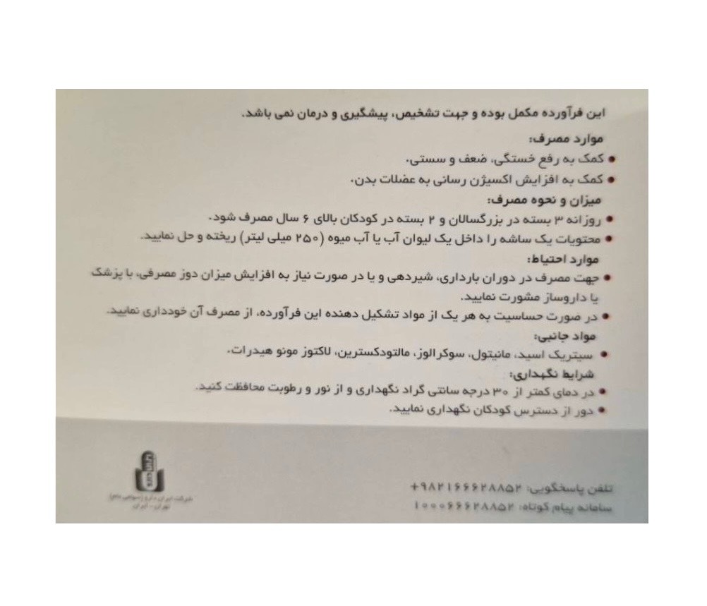 بزرگسالان روزانه یک ساشه را داخل یک لیوان آب یا آب میوه ریخته پس از حل کردن میل نمایند.