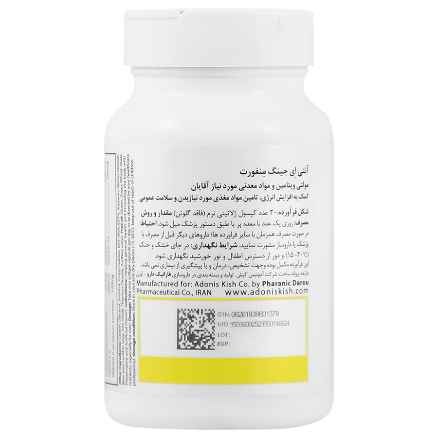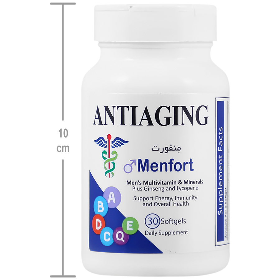 آنتی ایجینگ منفورت مکملی است که حاوی ویتامین های گروه B ویتامین A، ویتامین C و E و ویتامین D3 و مواد معدنی شامل زینک، کلسیم، آهن، منیزیم، مس، منگنز، کروم، ید، سلنیوم و اسیدهای چرب و اسید های آمینه مورد نیاز بدن و هم چنین کوانزیم کیوتن، اینوزیتول، لییکوپن، جنسینگ عصاره گیاه نخل اره ای و PABA که نیاز روزانه آقایان برای سلامت عمومی تامین کننده می باشد.