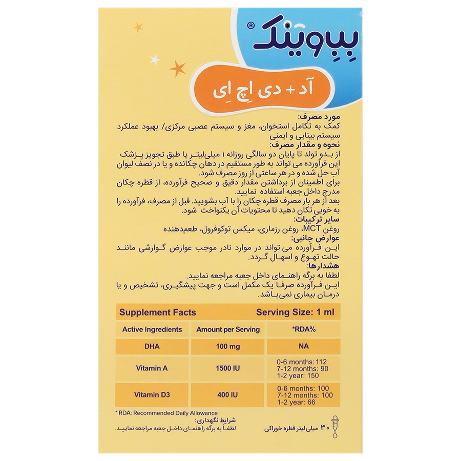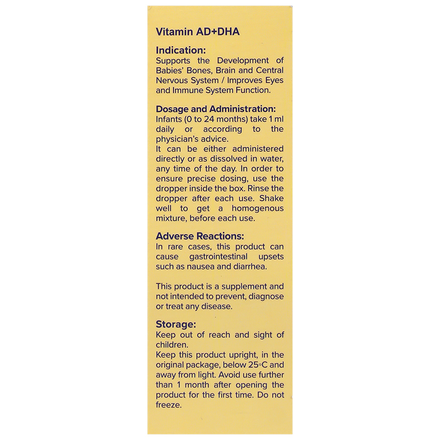 قطره ویتامین آ، ویتامین د3 و دی اچ ای یک محصول با کیفیت است که با تامین مواد مغذی اساسی به سلامت پوست، بینایی، استخوان و تکامل نرمال سیستم عصبی نوزادان کمک می کند. ویتامین آ برای کمک به رشد نوزادان و مبارزه با عفونت ها ضروری است. ویتامین د3 نیز متابولیسم نرمال کلسیم و فسفر را تنظیم می کند و به رشد و استحکام استخوان های نوزادان کمک می کند. دی اچ ای یک اسید چرب امگا 3 ضروری است که به عملکرد مغز و بینایی نوزادان کمک می کند. همچنین یکی از عناصر اساسی و اصلی برای مغز است که نقش مهمی در رشد و نمو سلول های آن ایفا می نماید.