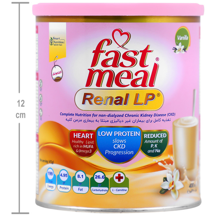 فست میل رنال ال پی با فرمولاسیون پیشرفته خود، مقادیر درشتمغذیها و ریزمغذیها را تامین کرده و نقش مهمی در پیشگیری از مشکلات تغذیهای ایفا میکند. این فرآورده برای افرادی که به دنبال مکمل غذایی کمپروتئین برای کنترل سطوح الکترولیتها، حمایت از سلامت قلب و عروق، کند کردن روند پیشرفت بیماری مزمن کلیه(CKD)، تامین کالری و انرژی روزانه خود هستند، تغذیهای کامل و تخصصی محسوب میشود. مصرف منظم فست میل رنال ال پی میتواند به حفظ تعادل کلیوی، بهبود سبک زندگی و حمایت از سلامت کلیه ها کمک کند، به ویژه در شرایطی که رژیم غذایی روزانه پاسخگوی نیازهای تغذیهای نباشد.