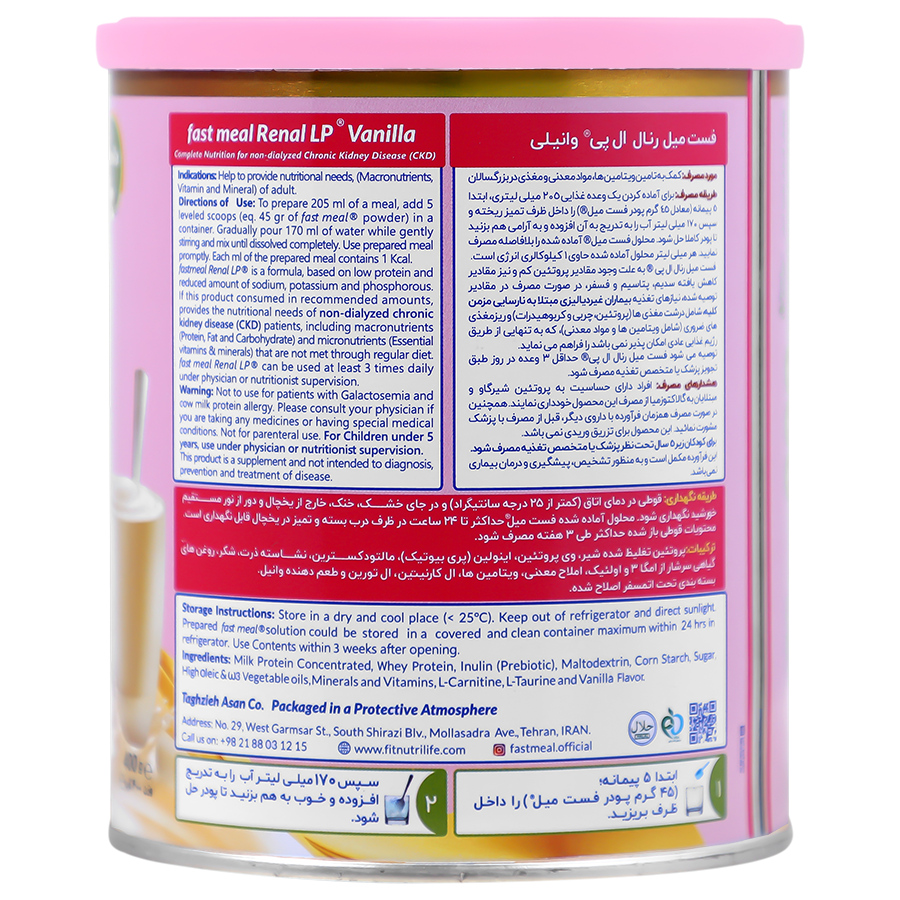 فست میل رنال ال پی برای پوشش نیازهای تغذیهای بیماران غیر دیالیزی مبتلا به بیماری مزمن کلیه (CKD) طراحی شده است. در شرایطی که تامین مواد مغذی ضروری بدون افزایش الکترولیتها از طریق رژیم غذایی روزانه چالش برانگیز میشود، این مکمل غذایی تخصصی برپایه پروتئین کاهش یافته میتواند، به صورت خوراکی یا گاواژ (با لوله) مصرف شود و انرژی و مواد مغذی مورد نیاز بدن را بدون فشار بر روی سیستم گوارشی تامین کند. این فرآورده به عنوان یک وعده غذایی تخصصی، جایگزینی ایدهآل برای وعدههای اصلی یا میانوعدهها در سبک زندگی پرسرعت امروزی است و به حفظ سلامت کلیه ها کمک میکند. اگر با چالشهای درمانی، کلیوی یا متابولیکی روبرو هستید و رعایت رژیم کمپروتئین برایتان دشوار است، فست میل رنال ال پی میتواند به کند کردن روند پیشرفت بیماری مزمن کلیه، تنظیم سطح الکترولیتها، حمایت از سلامت قلب و مقابله با سوءتغذیه کمک کند. ترکیب تخصصی فست میل رنال ال پی وانیلی شامل مقادیر کنترل شدهای از پروتئینهای با کیفیت بالا (مانند پروتئین وی و کازئین)، کربوهیدراتهای پیچیده، چربیهای سالم، اسیدهای چرب تکغیراشباع (MUFAs) و مجموعه کاملی از ویتامینها و مواد معدنی ضروری است که به حفظ تعادل کلیوی بدن کمک میکند.