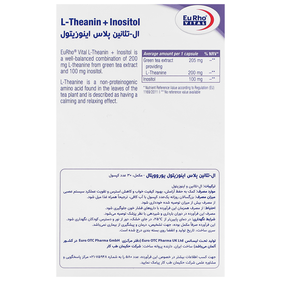 کپسول ال-تئانین پلاس اینوزیتول یوروویتال حاوی آمینو اسید ال-تئانین (استخراج شده از چای سبز) و اینوزیتول است که به بهبود عملکرد سیستم عصبی، افزایش احساس آرامش و ارتقای کیفیت خواب کمک میکند.