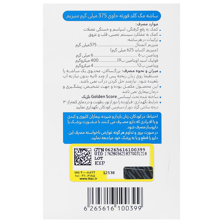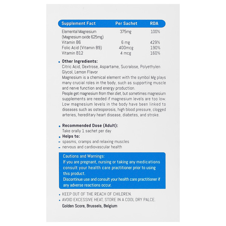 - حاوی 375 میلی گرم منیزیم، ویتامین ب6، فولیک اسید و ویتامین ب12