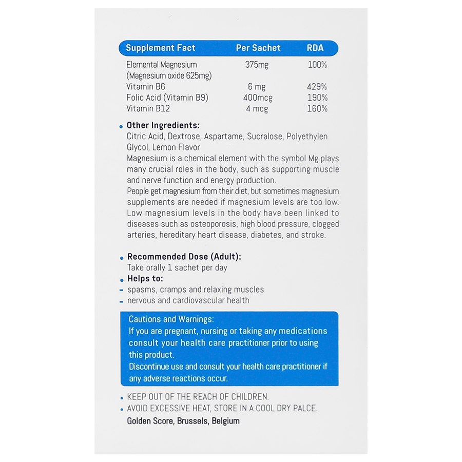 - حاوی 375 میلی گرم منیزیم، ویتامین ب6، فولیک اسید و ویتامین ب12