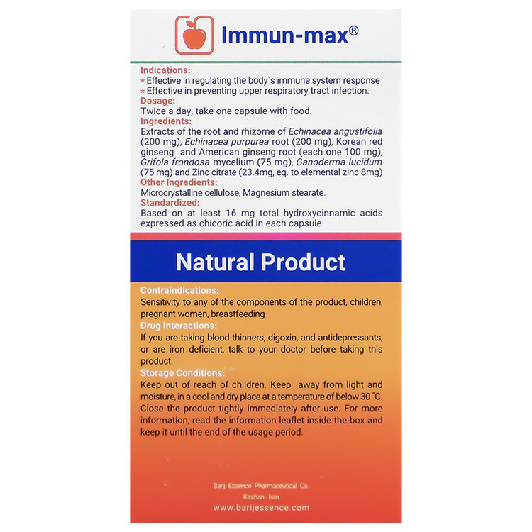 - موارد احتیاط: در صورتی که مشکل طبی دارید، قبل از مصرف با پزشک خود مشورت کنید. در صورت ابتلا به دیابت، اختلالات کبدی و یا علایم ناشی از مشکلات کبدی ( نظیر درد شکم، ادرار تیره و یا زردی ) قبل از مصرف با پزشک معالج مشورت کنید. چنانچه سابقه ابتلا به سرطان دارید و یا به بیماری های سیستمیک پیشرونده نظیر سل، لکوزیس،کلاژنوزیس، MS و ایدز مبتلا هستید یا اگر به بیماری های خود ایمنی مبتلا هستید و داروهای سرکوب کننده سیستم ایمنی مصرف می کنید قبل از مصرف فرآورده با پزشک خود مشورت کنید. اگر به اختلالات سیستم ایمنی ( نظیر بیماری کرون، میانستنی گراو، آرتریت روماتوئید، لوپوس اریتماتوز سیستمیک و ... ) مبتلا هستید، قبل از مصرف با پزشک مشورت کنید. برای استفاده بیش از 8 هفته با پزشک معالج خود مشورت کنید.