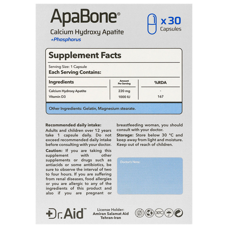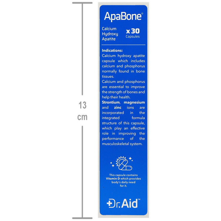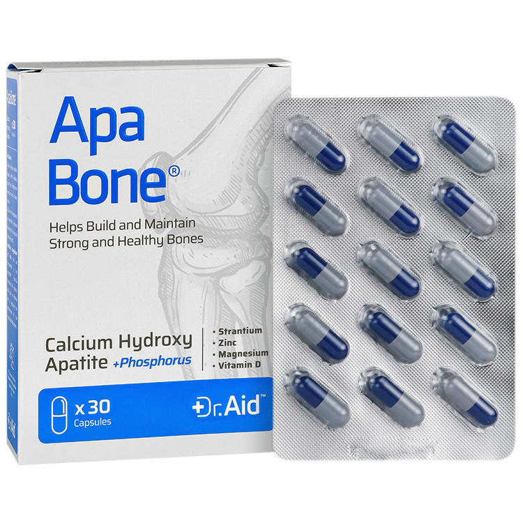 کپسول کلسیم هیدروکسی آپاتیت حاوی کلسیم و فسفر می باشد. این ماده به صورت طبیعی در استخوان ها یافت می شود. کلسیم و فسفر از مواد ضروری برای تقویت استحکام استخوان ها هستند و به سلامت آن کمک می کنند. همچنین در ساختار شبکه این مواد یون های استرانسیوم، منیزیم و زینک گنجانده شده است که در بهبود عملکرد سیستم عضلانی اسکلتی نقش موثری دارند. همچنین این محصول حاوی ویتامین D بوده و نیاز روزانه بدن به این ویتامین را به صورت کامل تامین می نماید.