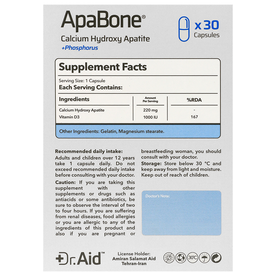 کپسول کلسیم هیدروکسی آپاتیت حاوی کلسیم و فسفر می باشد. این ماده به صورت طبیعی در استخوان ها یافت می شود. کلسیم و فسفر از مواد ضروری برای تقویت استحکام استخوان ها هستند و به سلامت آن کمک می کنند. همچنین در ساختار شبکه این مواد یون های استرانسیوم، منیزیم و زینک گنجانده شده است که در بهبود عملکرد سیستم عضلانی اسکلتی نقش موثری دارند. همچنین این محصول حاوی ویتامین D بوده و نیاز روزانه بدن به این ویتامین را به صورت کامل تامین می نماید.