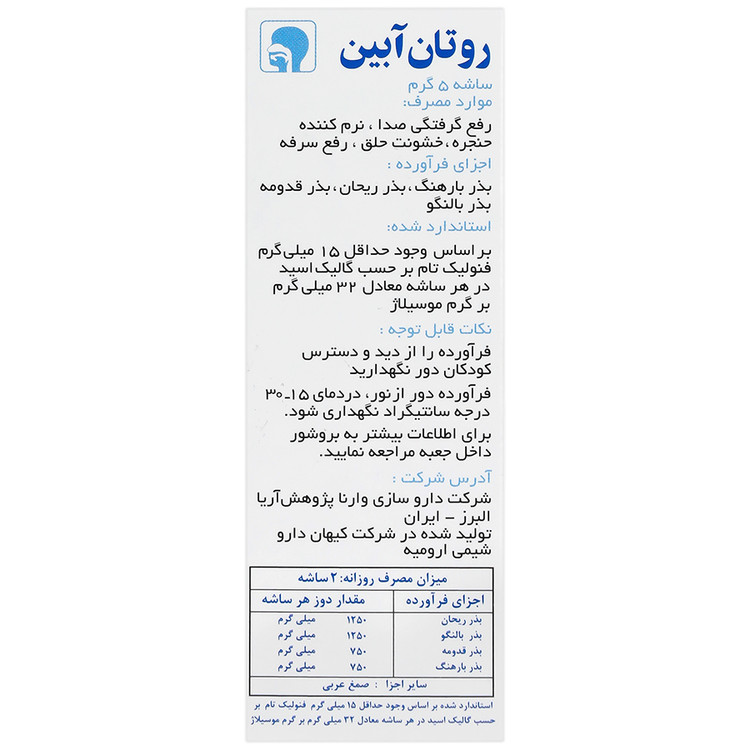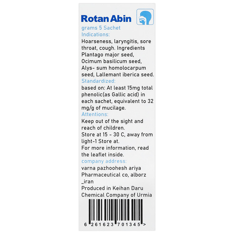 اختلال صوت یا گرفتگی صدا به داشتن صدای غیر طبیعی اشاره دارد. لارنژیت یا التهاب حنجره ناشی از انواع عفونت ها (سرماخوردگی، کرونا، عفونت های دستگاه تنفسی فوقانی و غیره). تحریک در نتیجه (GERD)، واکنش های آلرژیک سیگار کشیدن و آلودگی هوا و استفاده بیش از حد از صدا در خوانندگان سخنرانان علت اصلی گرفتگی صدا است. ساشه روتان آبین سرشار از ترکیباتی، چون موسیلاژ، فلانوئیدها تانن ها و برخی مواد فیتوشیمیایی دیگر است که به عنوان تسکین دهنده ضد التهاب و ضد میکروب عمل می کند. بنابراین این فرآورده گیاهی را می توان در انواع گرفتگی صدا، لارنژیت، سوزش گلو و سرفه استفاده کرد.