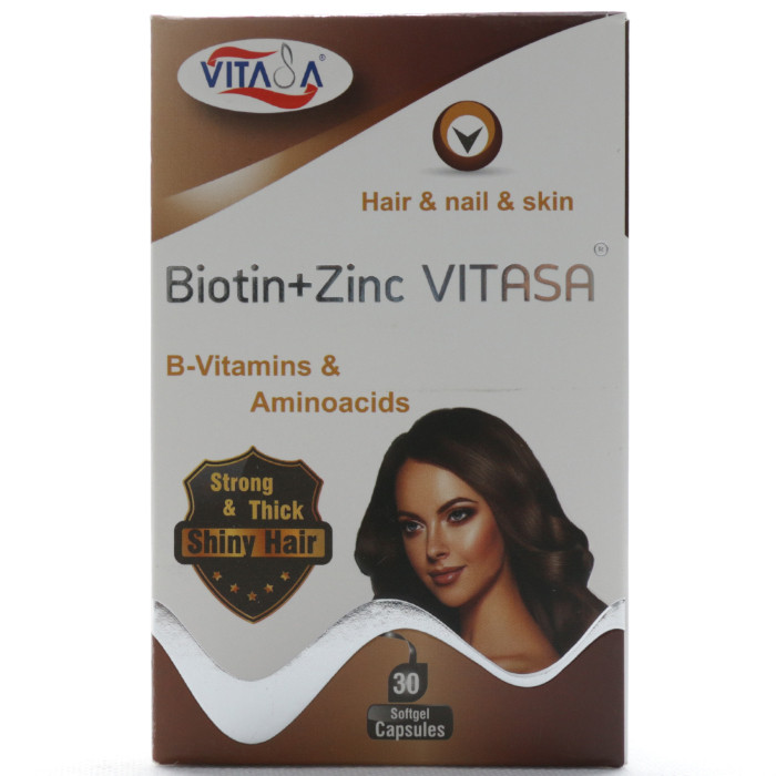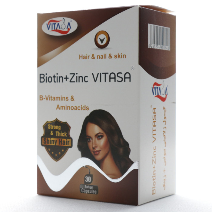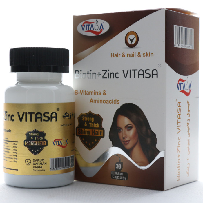 سافت ژل بیوتین پلاس زینک ویتاسا، مکملی است حاوی بیوتین (ویتامین B7) و روی که نقش مهمی در حفظ و بهبود سلامت پوست، مو و ناخنها می باشد.