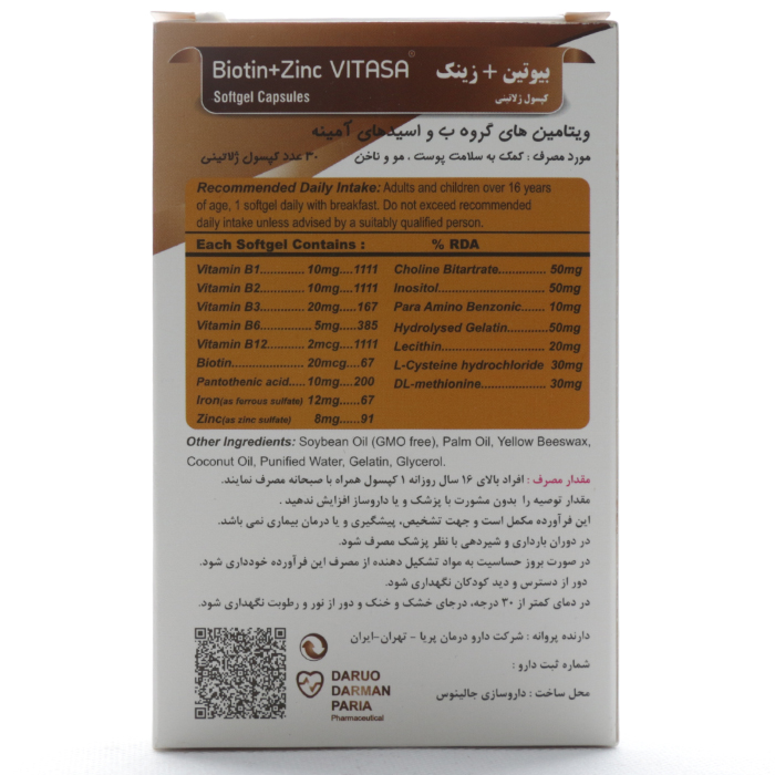 سافت ژل بیوتین پلاس زینک ویتاسا، مکملی است حاوی بیوتین (ویتامین B7) و روی که نقش مهمی در حفظ و بهبود سلامت پوست، مو و ناخنها می باشد.
