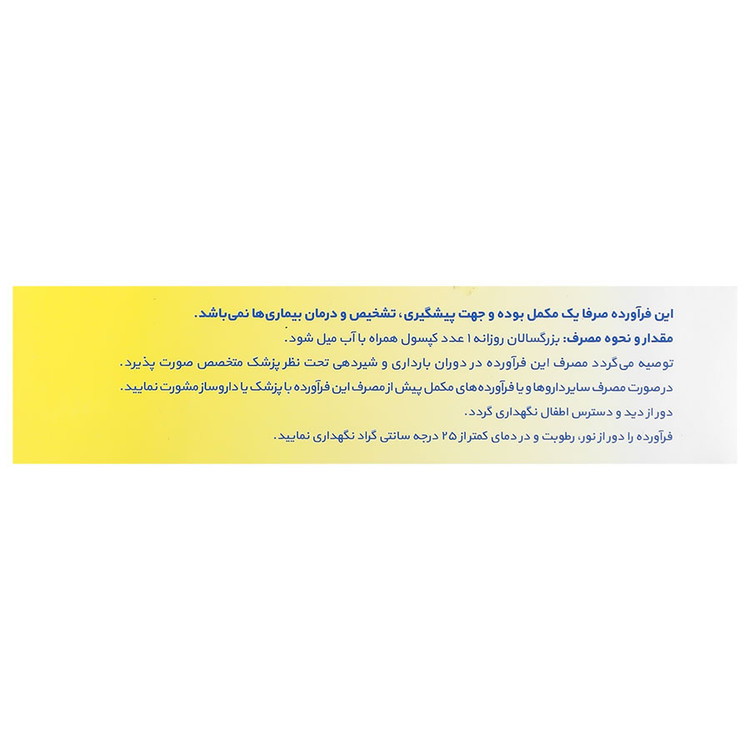 - این فرآورده صرفا یک مکمل می باشد و جهت تشخیص، پیشگیری و یا درمان بیماری ها تجویز نمی شود.
