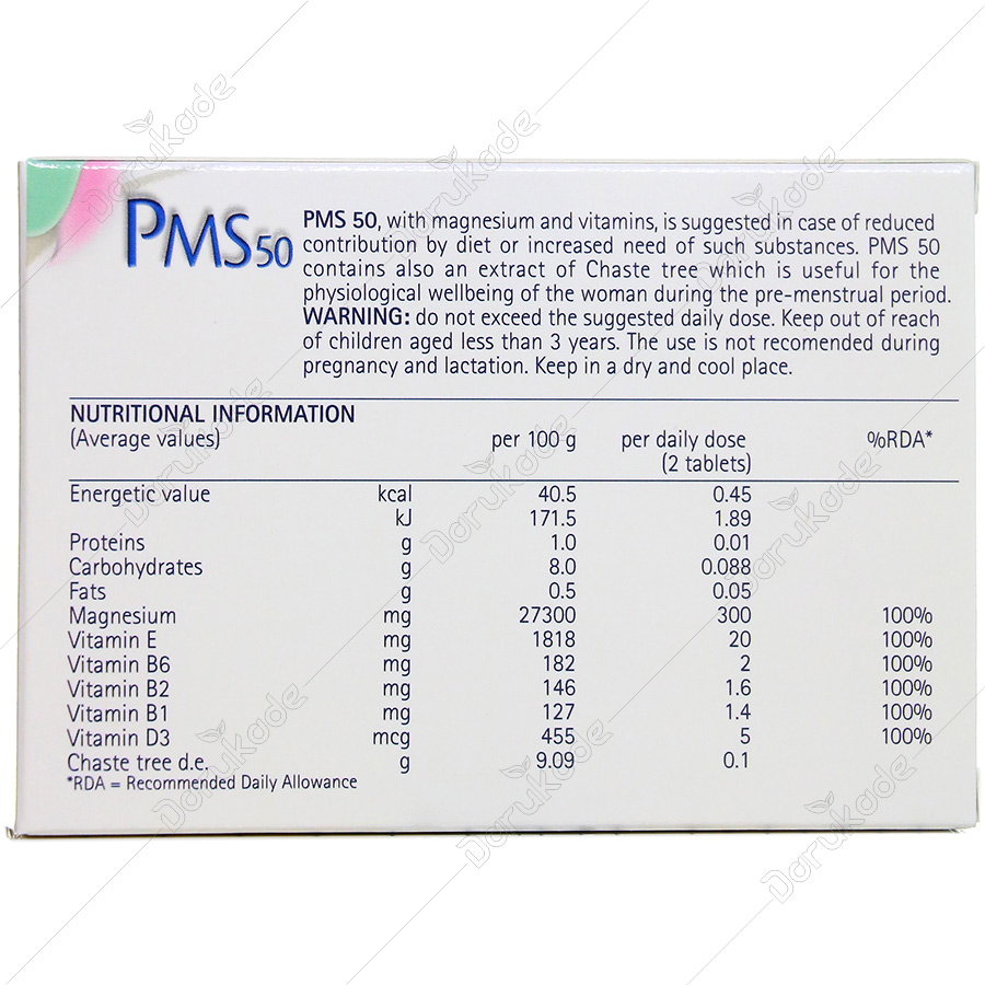 - pms 50، حاوی ویتامین های E، D3، B1 و B2