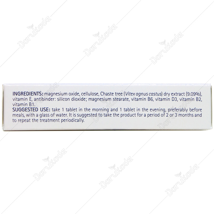 مواد اکتیو و فعال: عصاره خشک (Chast (Vitex Agnus Castus ویتاگنوس 50 میلی گرم اکسید منیزیم 250 میلی گرم (Magnesium Oxide) ویتامین های D3 ،B1 ،B6 ،E PMS (اختلالات و سندرم قبل از قاعدگی از قبیل سر درد، سرگیجه، اضطراب، افسردگی، اختلالات عصبی، کمر درد، درد مفاصل، دردهای شکمی و غیره) در بعضی دوشیزگان و بانوان به حدی است که زندگی روزمره و حتی کار روزانه، اثر منفی در بر دارد. PMS، با عدم تعادل بین سطح استروژن و پروژسترون در بدن ایجاد می گردد. همچنین سطح پایین سروتونین در ایجاد و پیشرفت PMS می تواند مؤثر باشد.