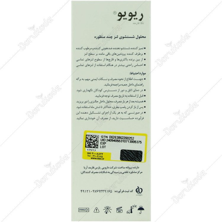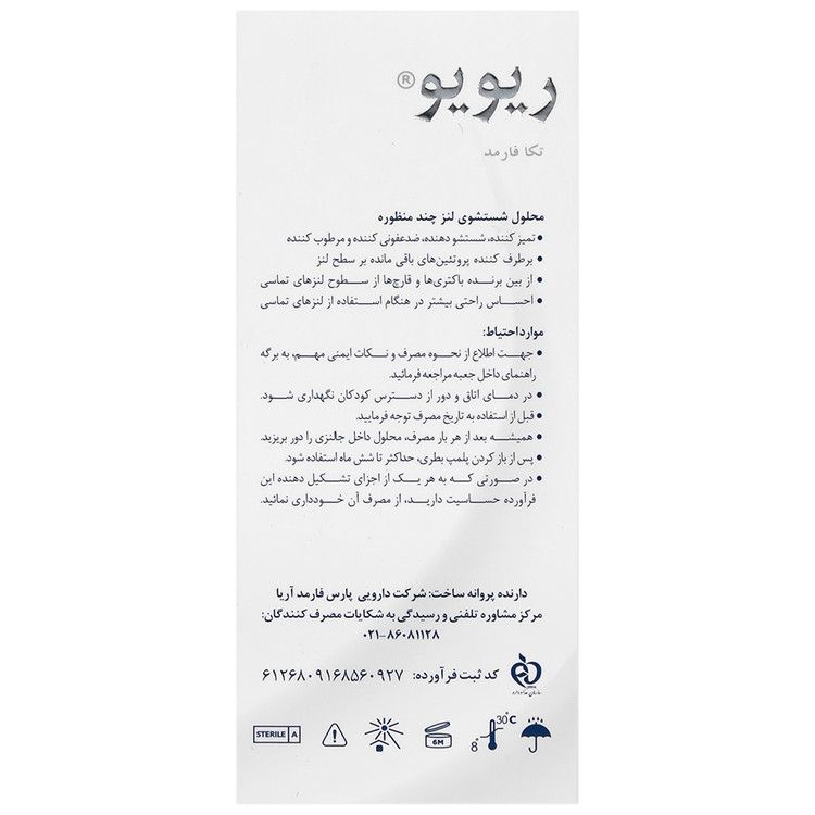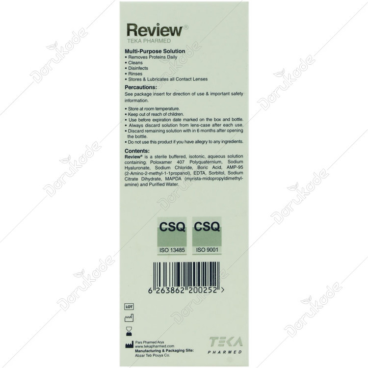 محلول چند منظوره شستشو و نگهداری لنزهای چشمیREVIEW چیست و چه کاربردی دارد؟1- فرمولاسیون ترکیبات موجود در محلول REVIEW با الهام از شرایط فیزیولوژیک چشم طراحی شده است. این محلول حاوی روان کننده ای ایده آل است که رطوبت از دست رفته چشم را بازیابی می کند. در نتیجه متعادل کننده ای عالی جهت بهبود فعالیت چشم خواهد بود.2- استفاده روزانه از محلول ،REVIEW پروتئین ها، ذرات آلودگی و لایه های ته نشین شده را از سطح لنز حذف می کند، از انباشته شدن آلودگی های مضر و تحریک کننده روی لنز جلوگیری و لنز را ضد عفونی می کند.3- محلولREVIEW ، حاوی هیالورونیک اسید می باشد که استفاده مجدد از لنز را بسیار راحت خواهد کرد. هیالورونیک اسید، یک پلی ساکارید طبیعی و عامل لغزان کننده اصلی موجود در اشک چشم است.4- محلول REVIEW یک پوشش از هیالورونیک اسید در سطح لنزها ایجاد می کند که مانع از اثر تحریکی لنز بر سطح قرنیه می شود و با رطوبت رسانی مناسب استفاده از لنزهای تماسی را راحت و قابل تحمل تر خواهد کرد.5- یکی از مهمترین خطراتی که استفاده طولانی مدت از لنز ایجاد می کند، ابتلا به عفونت آمیبی خطرناکی به نام کراتیت آکانتاموبا (Acanthamoeba Keratitis) است، محلول REVIEW با ضد عفونی کامل لنز، مانع از تکثیر این آمیب خواهد شد.